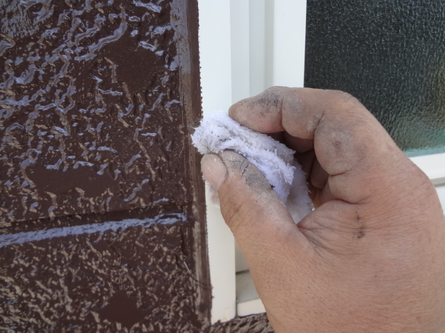 どうしても養生した隙間から塗料が入り込んでしまう事があります、養生を剥がした後サッシ周りを見てみるとサッシに塗料が付着している所があります、そこをシンナー等で落として行きます【落とさない業者さんもいます】