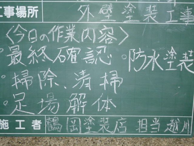 今日もひとどおり確認をしましたけど、明日はベランダ床の塗装、最終確認、足場解体、掃除、清掃をして完工です!!