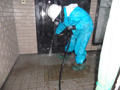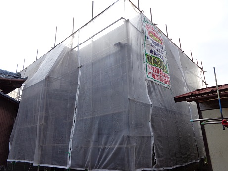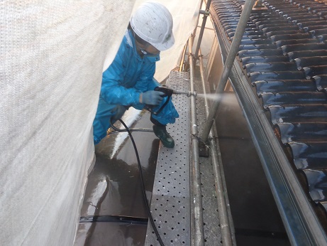 次に飛散防止のメッシュシートを張り洗浄開始です!