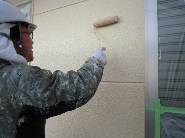 軒天の処理が終わり、中塗りの乾燥を十分に待ったら上塗りに入ります。