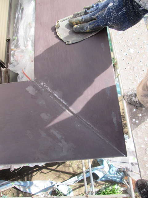 次に屋根の方を進めていきます。まずは板金のケレンです。前の塗料のめくれや、凹凸等を専用の紙ヤスリ等で擦ります、この作業をしないと塗料の密着性や見た目にかかわってくるので大事な作業です!