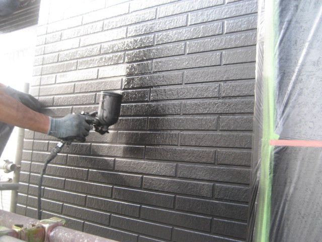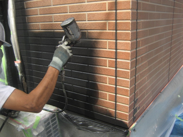 今回はスプレーガンを使って作業をしました、目地の色が黒になるので一度壁全体を黒で塗装して、その後から表面だけを塗っていきます!