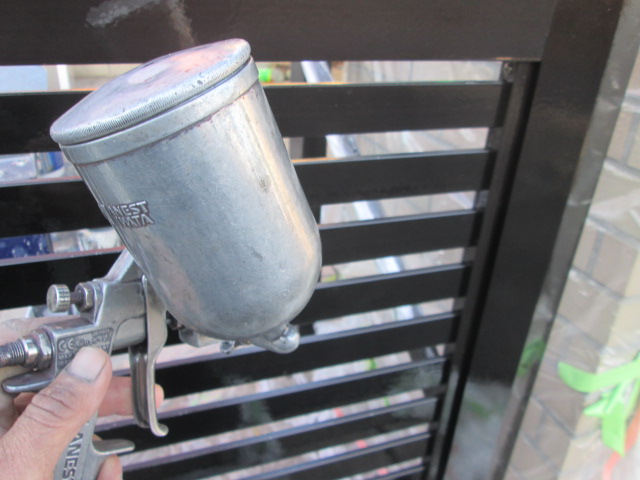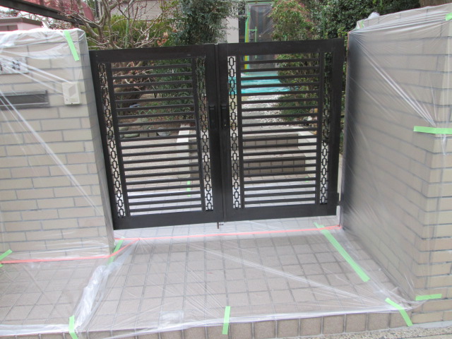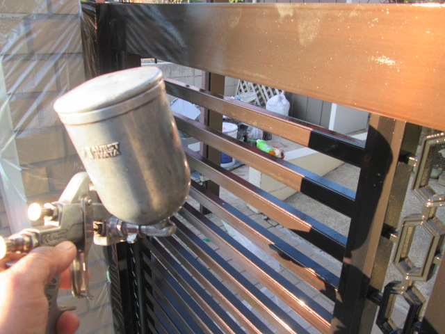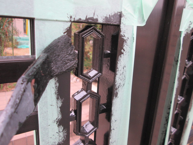 次に門扉塗装なんですが、前に塗装をしてありお客様の要望により今回は塗装させていただきました。まずは飾りの所を黒で塗ります刷毛で塗りましたので、塗り残しがないようにしっかり塗っていきます。