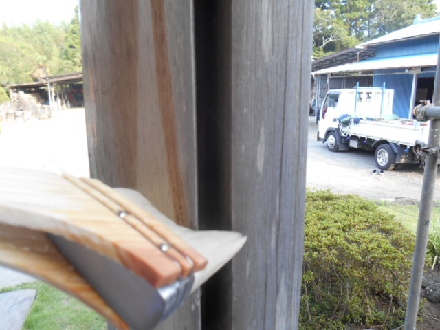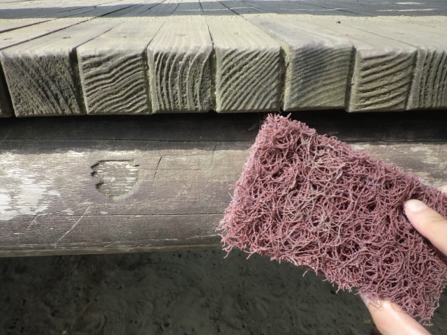 最初に木部のあく洗いです!昨日とおなじように、薬品を使い木部に染み込ませます!