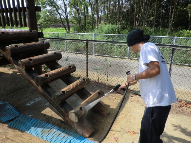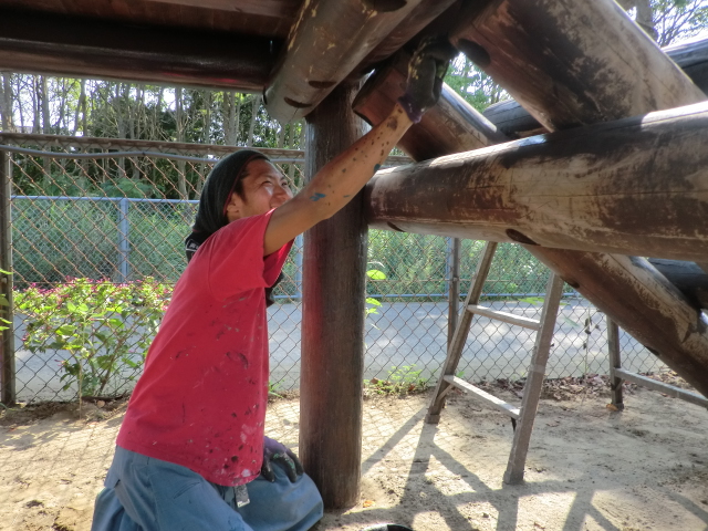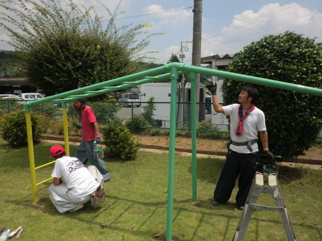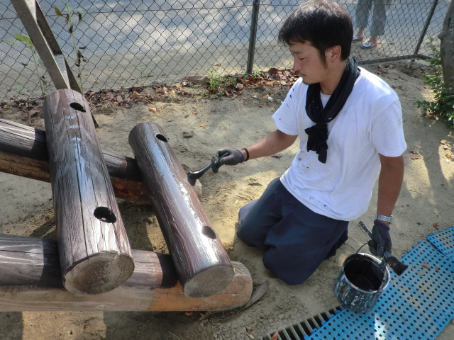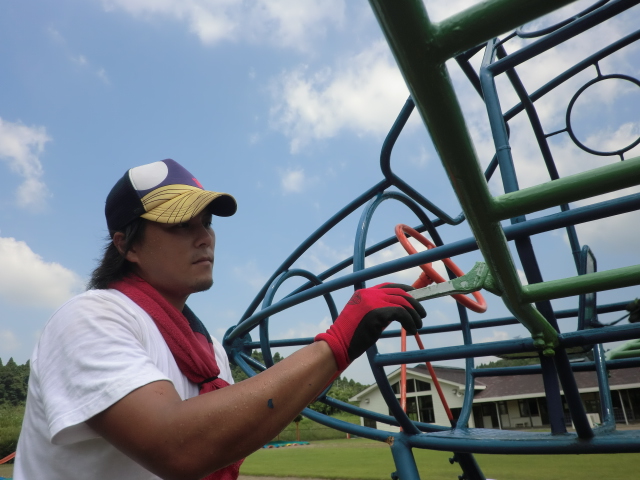 少しでも長く子供達が綺麗な遊具で遊べるように、職人も真剣な眼差しです\(゜ロ\)(/ロ゜)/
