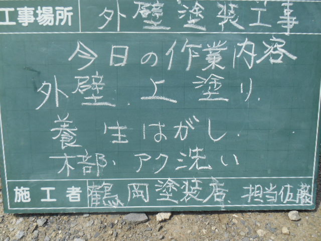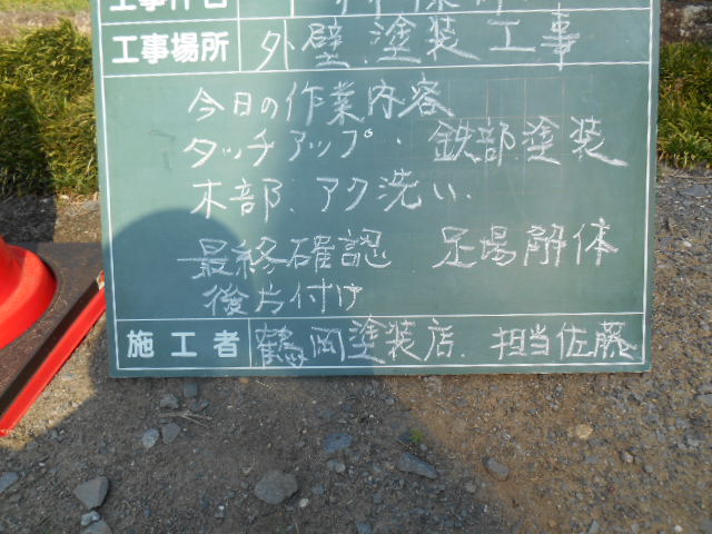 それでは、今日の仕事内容です!鉄部塗装、タッチアップ、木部あく洗い、掃除、足場解体、あと片付です!