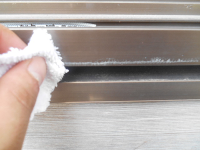 窓廻りのビニールを取り終わり、次に玄関周りの木部のあく洗いです!