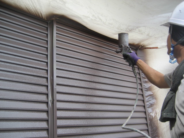 次は雨戸の塗装です!壁が仕上がっているので廻りに飛ばないようにしっかり養生してからカップガンで仕上げます!