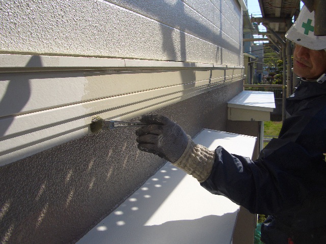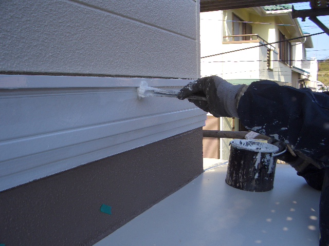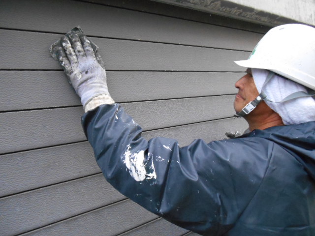 プライマーを塗る事によってサイディングとシーリングの密着性を高めます、プライマーが乾いたら次にシーリング材を注入して専用のヘラで平らにして行きます!