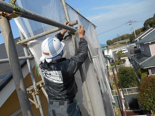 近隣の住宅や植木、その他周りの物に塗料や土が飛び散らないようにメッシュシートで建物全体を覆っていきます。