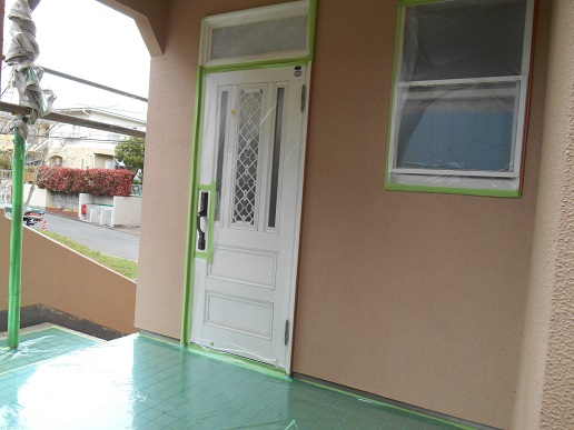 たまにお客様から「玄関は出入りできますか?」と聞かれるのですが、もちろん玄関ドアも写真のように養生しますが職人技でしっかり出入りできるように養生いたします。