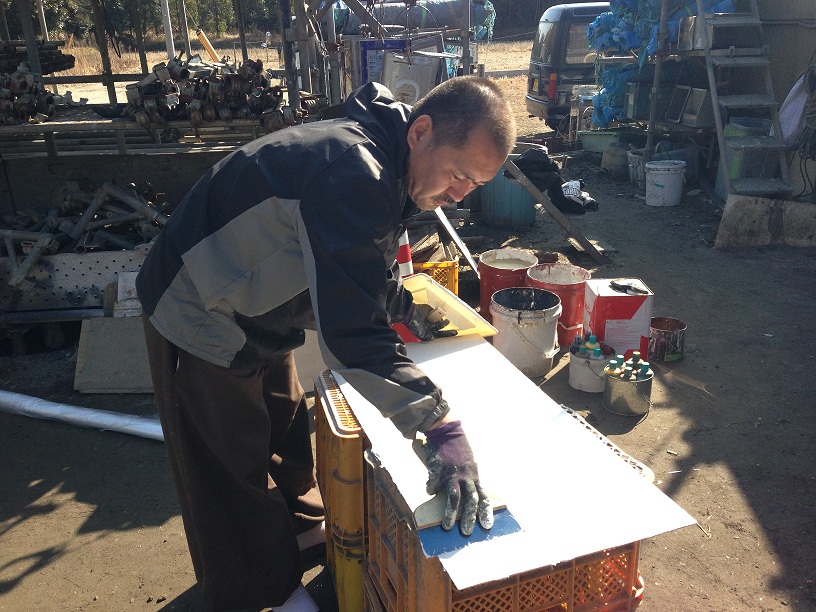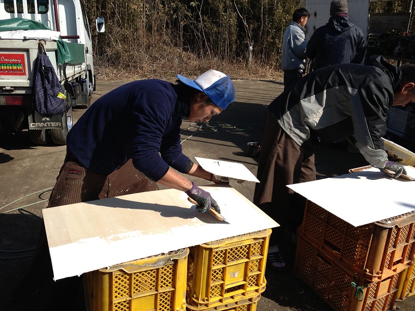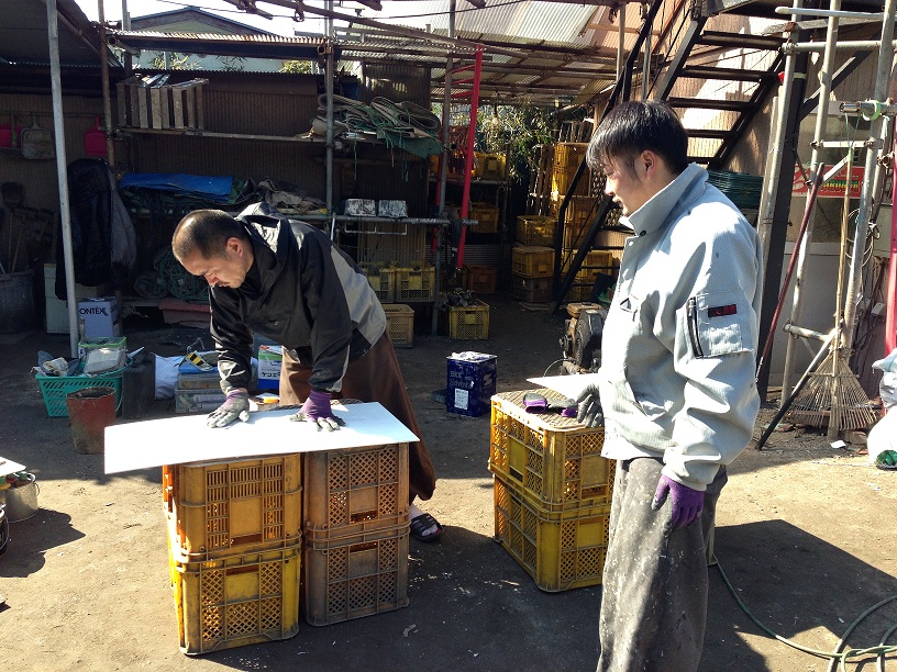これは真剣な顔でパテ処理をしている越川さんと小川君の様子です。